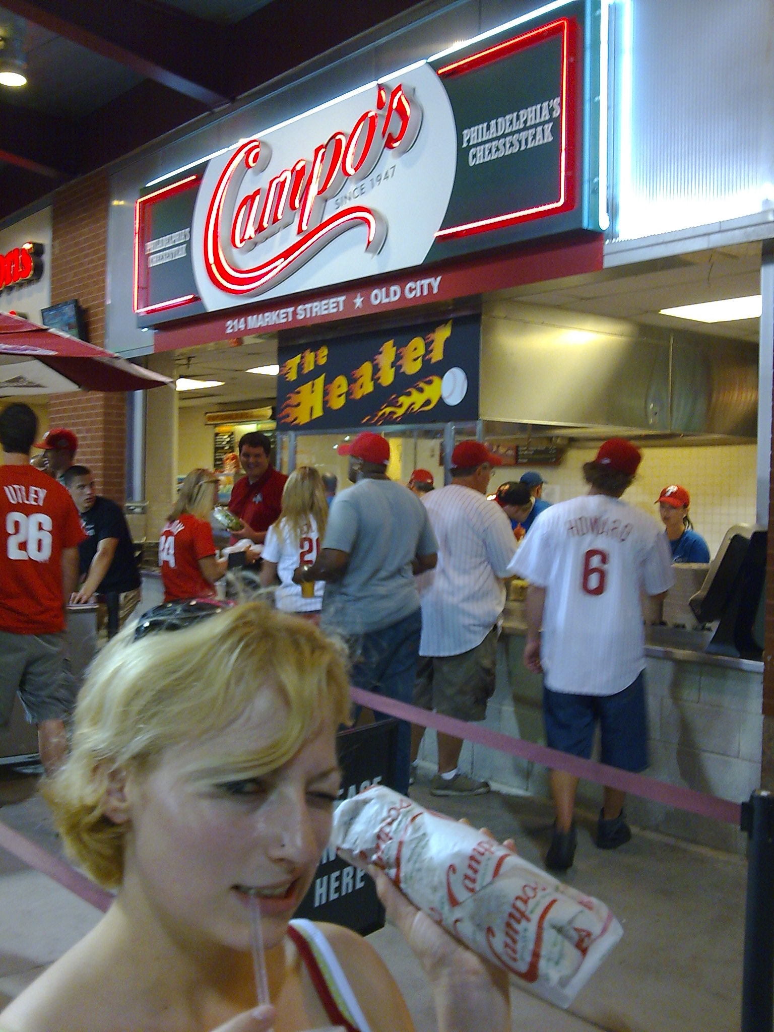 After we’d had enough, we went to look for the vegetarian cheese steaks that I knew were in here somewhere. I knew it might take us all night going to every kiosk to find it, so I asked a pleasantly helpful cashier where I might find one, and she knew. We headed to the first level concourse where Campo’s is located. The lines weren’t too long at all, and I ordered one veggie american wit.