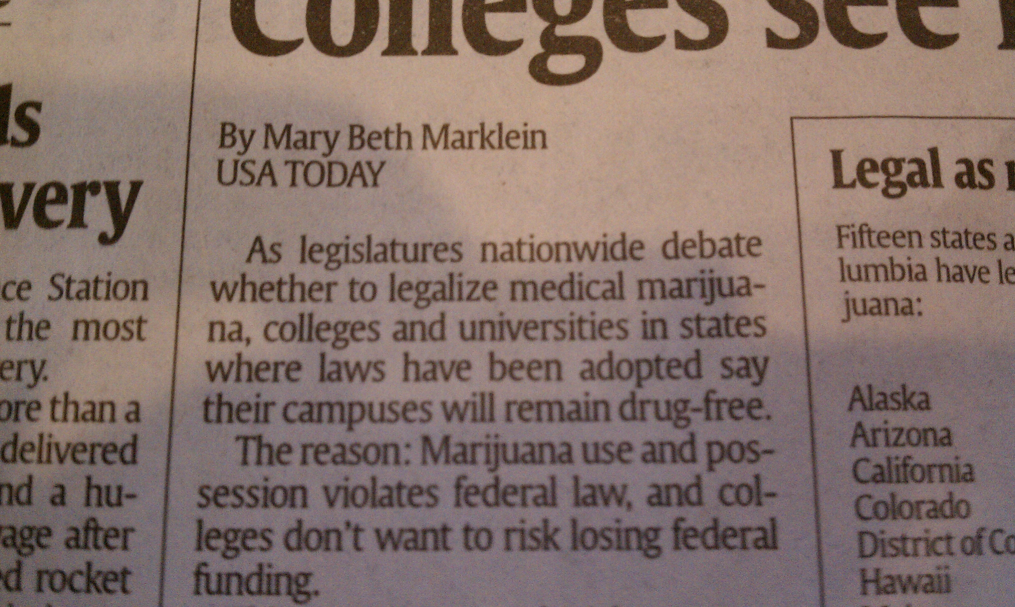Posted in Daily Pictures, Reflections on March 10, 2011 by VergeThe first sentence of this article reads, “As legislators nationwide debate whether to legalize medical marijuana, colleges and universities in states where laws have been adopted say their campuses will remain drug-free.” You’ve gotta’ be kidding me, right? Deans actually believe that by not allowing those who medically NEED marijuana for diagnosed illnesses onto their campuses and into their dorm rooms, that their colleges will then be “drug-free.” Seriously, the only thing that this can accomplish is to drive the price of medical marijuana higher because it will be a slight but more difficult to obtain while on campus. In fact, I’m pretty sure, regardless of their policies, when someone really needs to score some pot, a college campus might us a solid place to start asking around, if you know what I mean.
