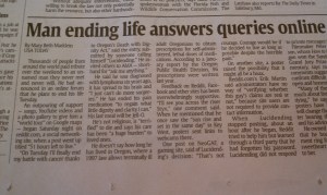 This story may or may not have turned out to be true, I don’t know. But, I do applaud states that have a law allowing people to end their own lives with dignity. Not that it shouldn’t be signed off on by a doctor, which in this case, it has to be. You must see a doctor to get the prescription for enough pills that will be fatal if taken as prescribed. This particular man had terminal cancer, and wanted to die lucidly and wanted to put an end to the burden and suffering he knew he was causing his family. He stopped his pain killers, and started sharing his business with the world. Don’t know if he’s dead yet or not, but like another very sensitive subject, I’m glad the law was pro-choice and not pro-“you can’t make decisions about your own” life.