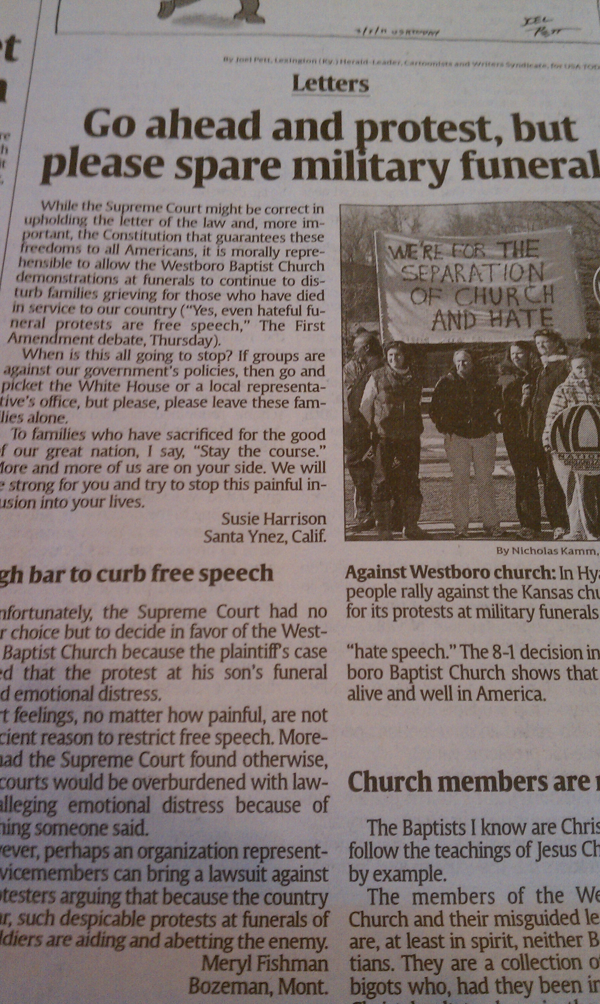 okay, protesting near dead soldiers funerals has gotta’ be one of the most despicable acts you can do to protest homosexuality other than actually attacking gays. It truly is disgusting. But, unfortunately I have to agree with the ruling that they must be permitted to protest in the manner that they have been. They have been peaceful, kept their distance, applied for permits, and cooperated with authorities. Really, as poorly founded as their message is, they truly are model protesters. It’s like the movie Old School…”they’re really good at paperwork, it’s really quite an anomaly.”