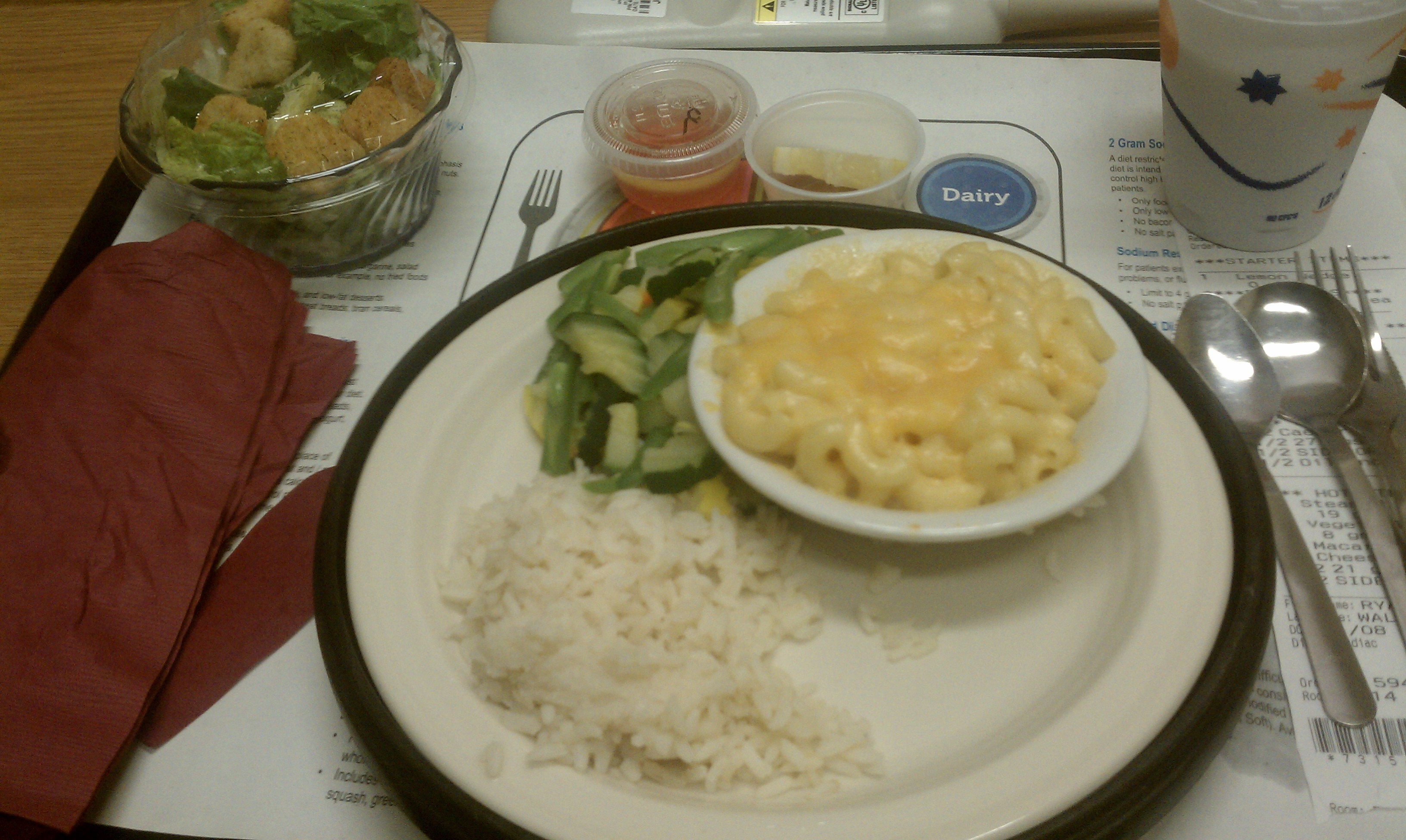 You know it's not a good sign when they serve you dinner in the ER. By that time, I knew they were keeping me overnight. You don't get a free meal unless they're raping an insurance company, so I settled in and ate what was the best vegetarian meal they could come up with: salad, mac n' cheese, white rice and too-steamed veggies. I was also officially on a low sodium/cardio diet, but I'm not sure that's any different from what I would choose to eat anyway.