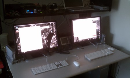 This is a picture of my (kind of) new desk at work. I’m not official working in this new department, but I’m there two days a week, and I almost know what I’m doing. Hopefully, someday, this will be my permanent one. Yes, they are all my computers, and notice, there is no film on my desk.