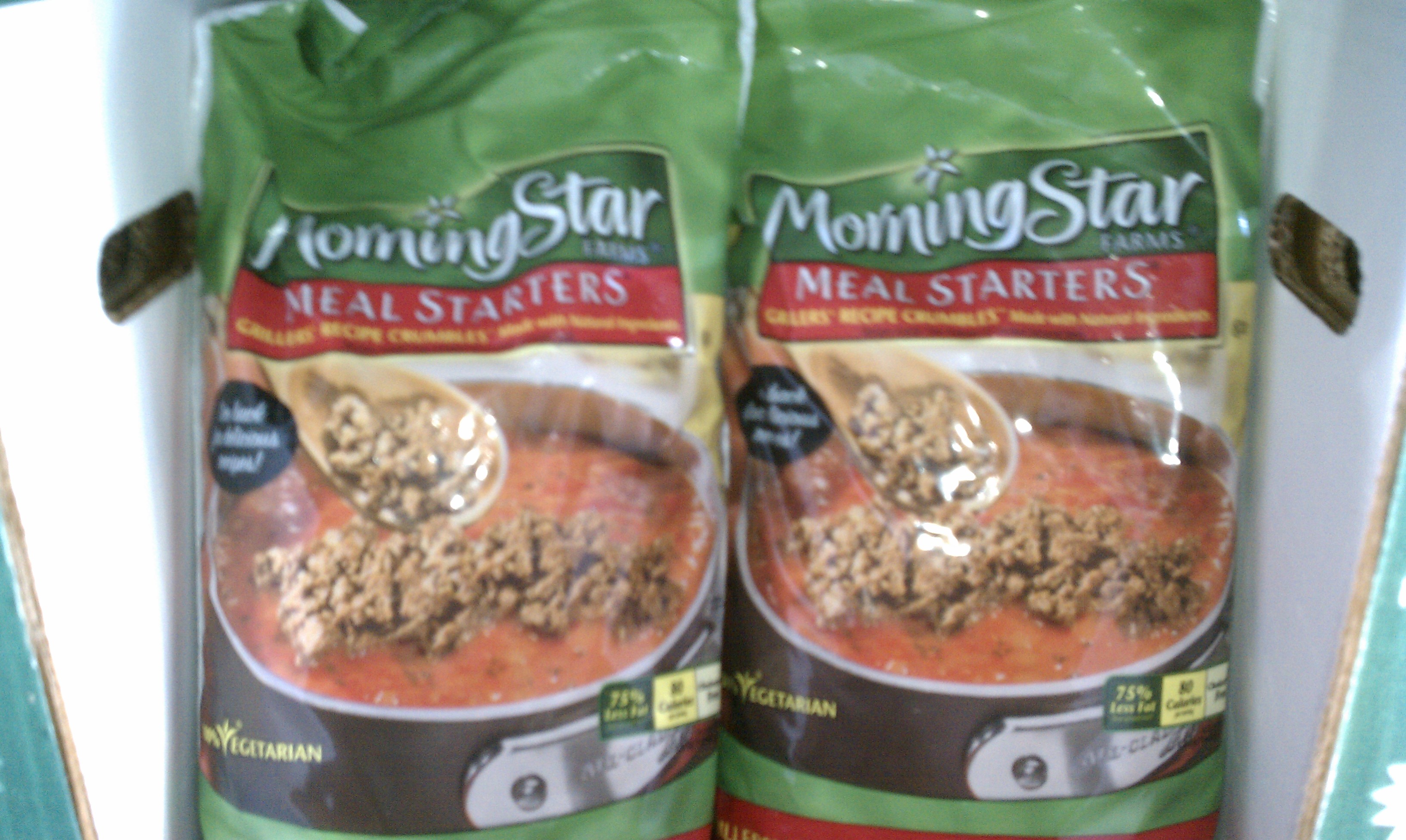 Morning Star Meal Starters Crumbles are a great substitute fro ground beef. The main ingredient is a flavored TVP (textured vegetable protein). For tacos, burritos, and chilli, this products is a great vegetarian substitute. Unfortunately it as also NOT VEGAN as it contains skim milk and egg whites.