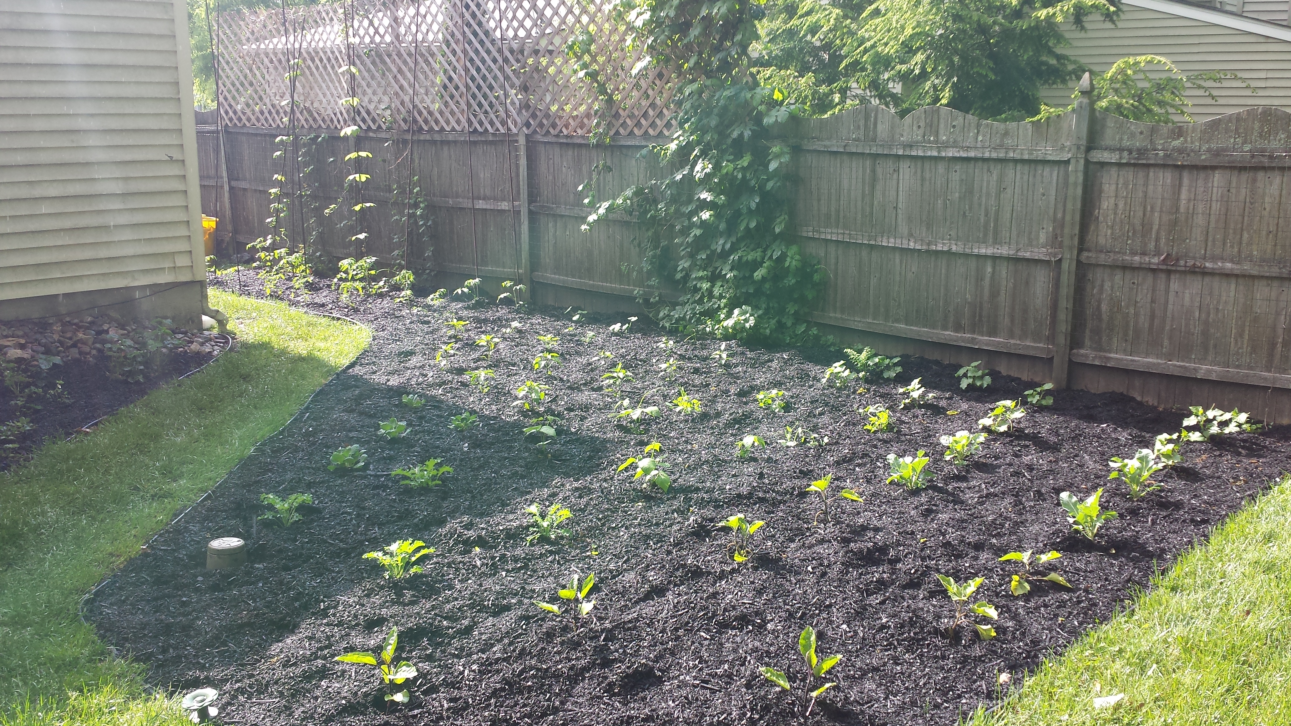 The organic vegetable garden this year. The usual inhabitants: cukes, tomatoes (4 kinds), peppers (4 kinds), hops climbing the fence (3 kinds), bush beans, eggplant (2 kinds), kale, and brussel sprouts.