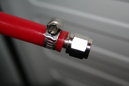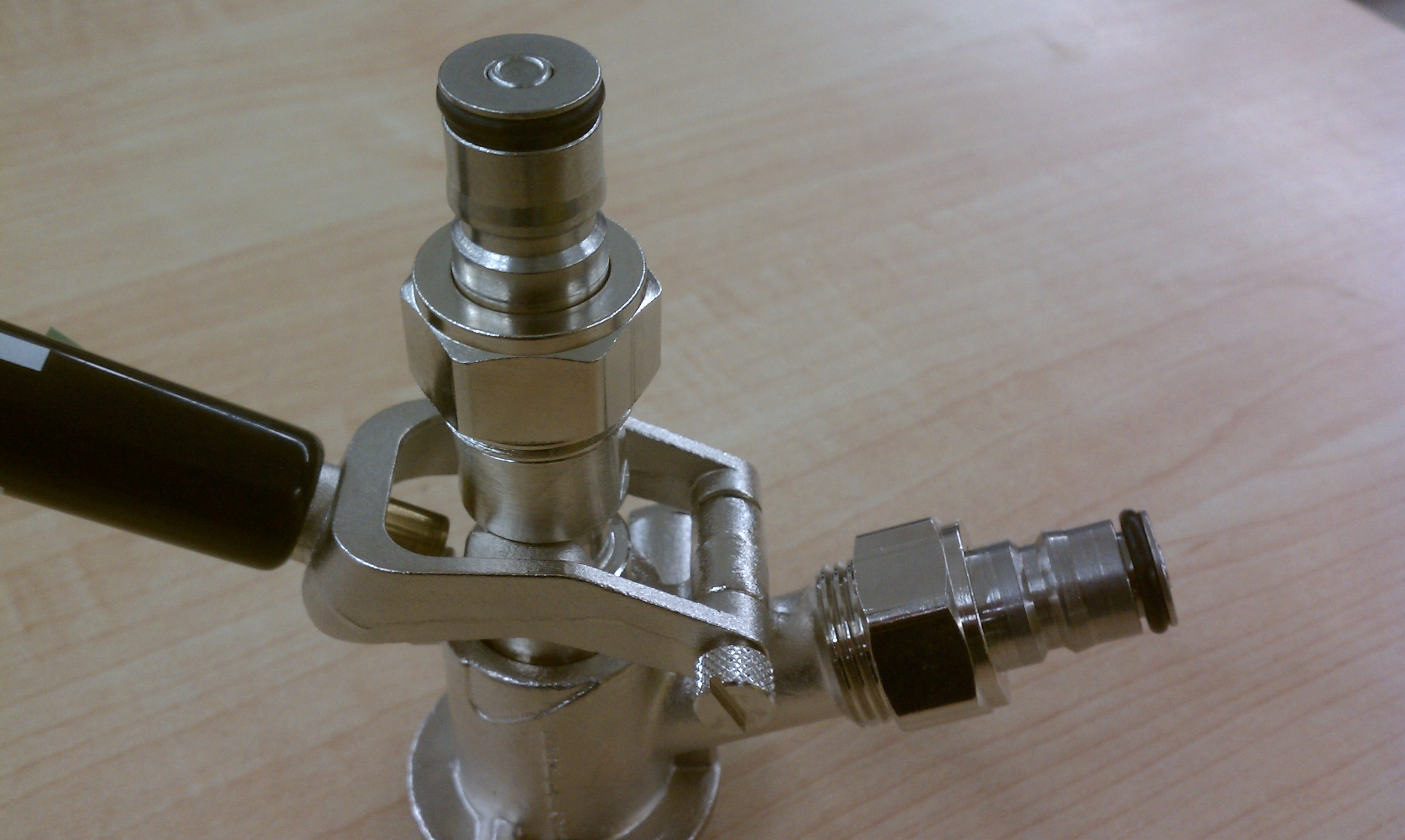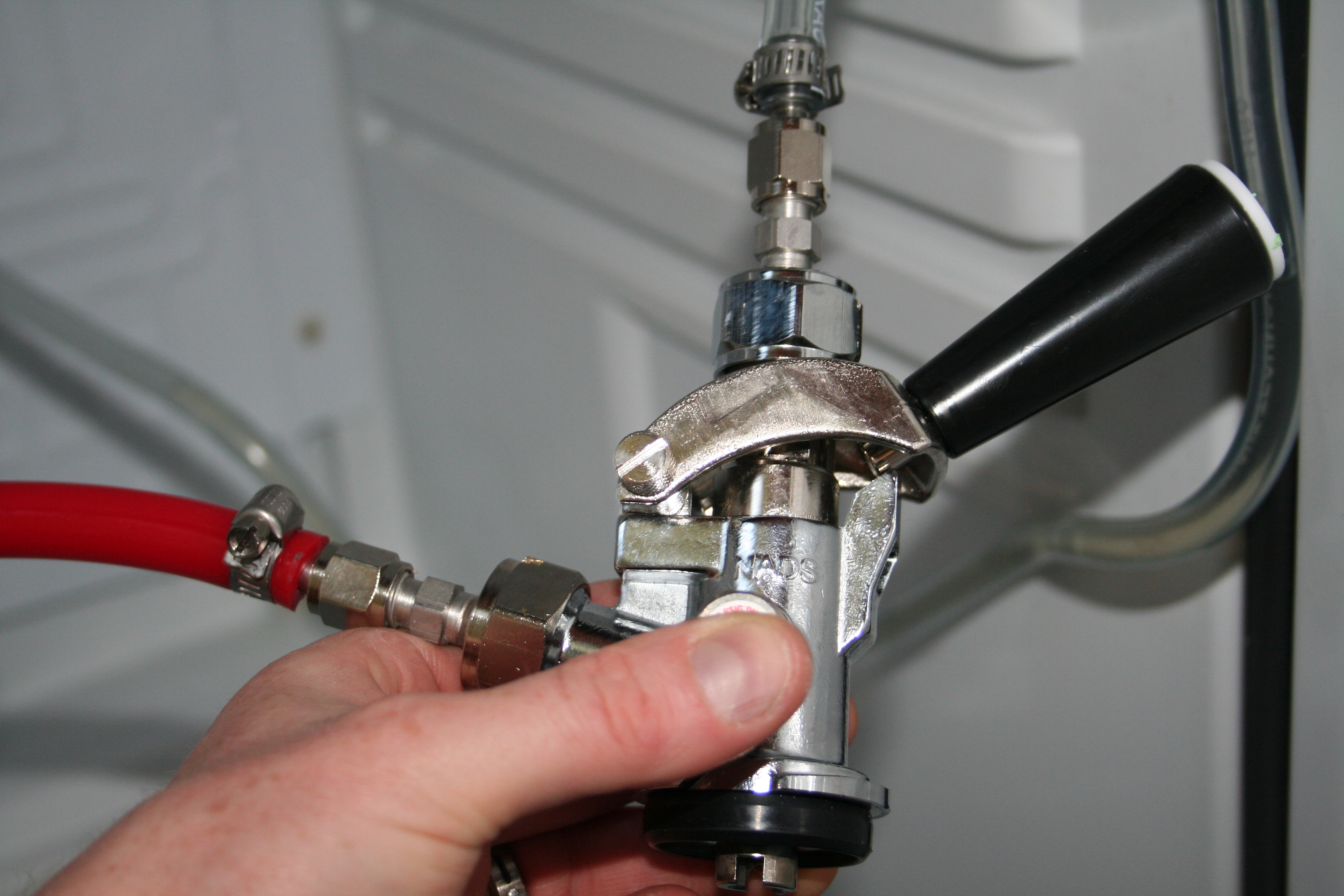 Your Kegerator “coupler” probably looks similar to this. The air line comes in from the side, and the beer is dispensed from the top. The lines on this one are clamped with screw clamps. Even if yours has crimp clamps, no worries. You won’t have to pry them with pliers.
