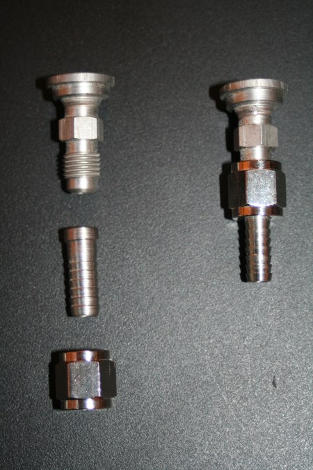UPDATE!!! Here’s another way to do it, if your home brew store carries the parts. You can get tailpieces that fit onto “D” Sanke couplers that are Cornelius/home brew keg posts.