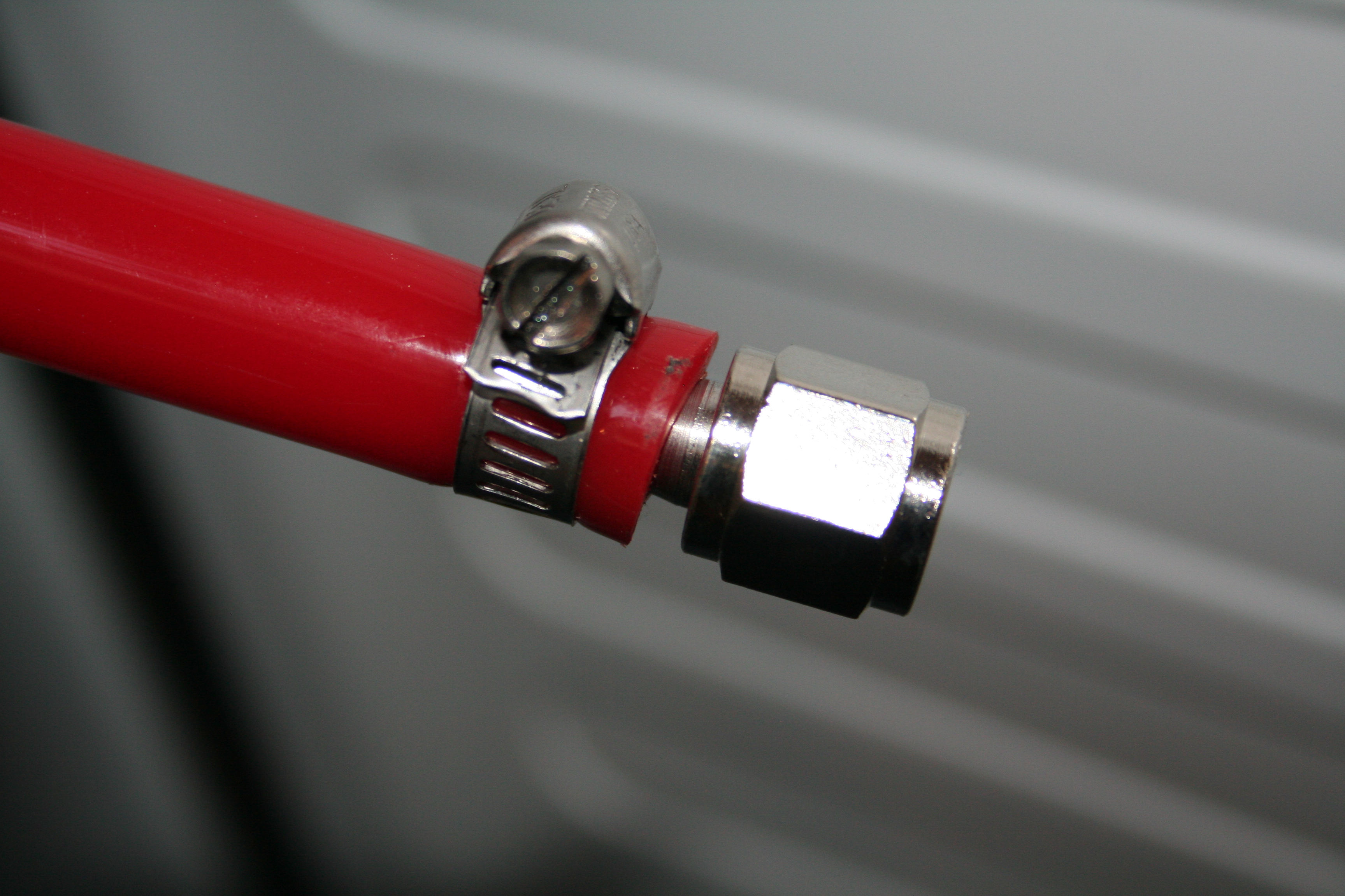 You’ll now have two open tubes going to your CO2 tank, and your tower and faucet. Insert the swivel set through it’s corresponding nut and into the tubing. Remember to slide the screw clamp over the tubing first so that you can tighten it onto the barb once inserted into the tubing.