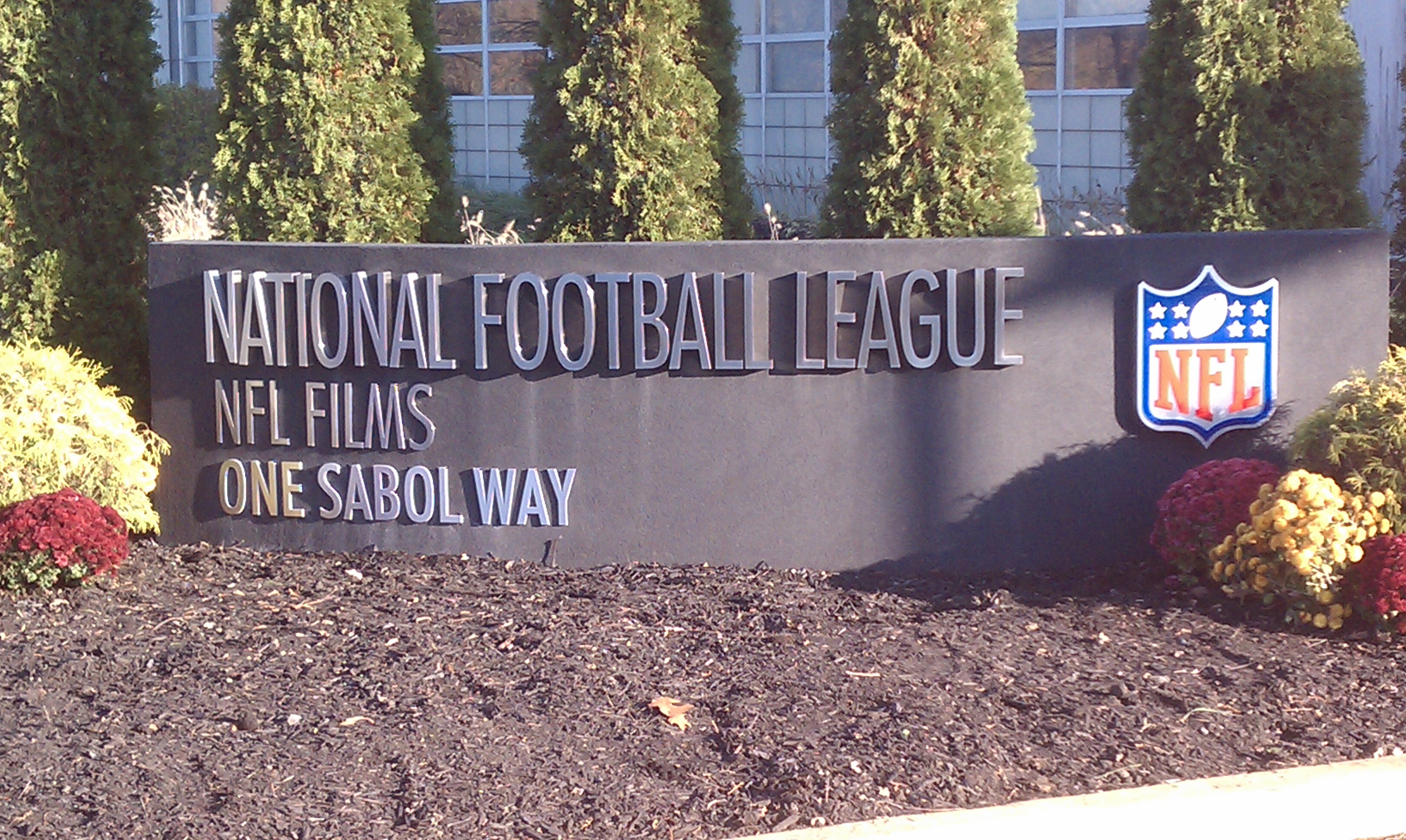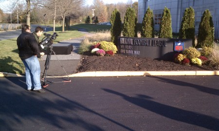 The flagpoles in the front lawn of NFL Films was actually one of Steve’s last requests. We never had them before last year, and he thought that we should. The third flag pole was flying a Giant’s logo last week, and it was supposed to commemorate the reigning Super Bowl Champions. That tradition was short lived. The tree in the foreground was planted in memory of Steve, who loved the outdoors, and symbolizes the continued growth of NFL Films.