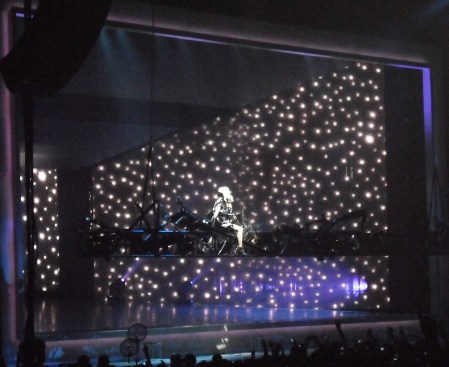 - She had pretty creative stage projections during her costume changes. They were filmed like short movies, and were projected on a huge, stage wide scrim that they lowered when she exited for a break. They kept us entertained in a multimedia kind of way, giving us something of substance to watch instead of smoke machines and circular drum machine loops.