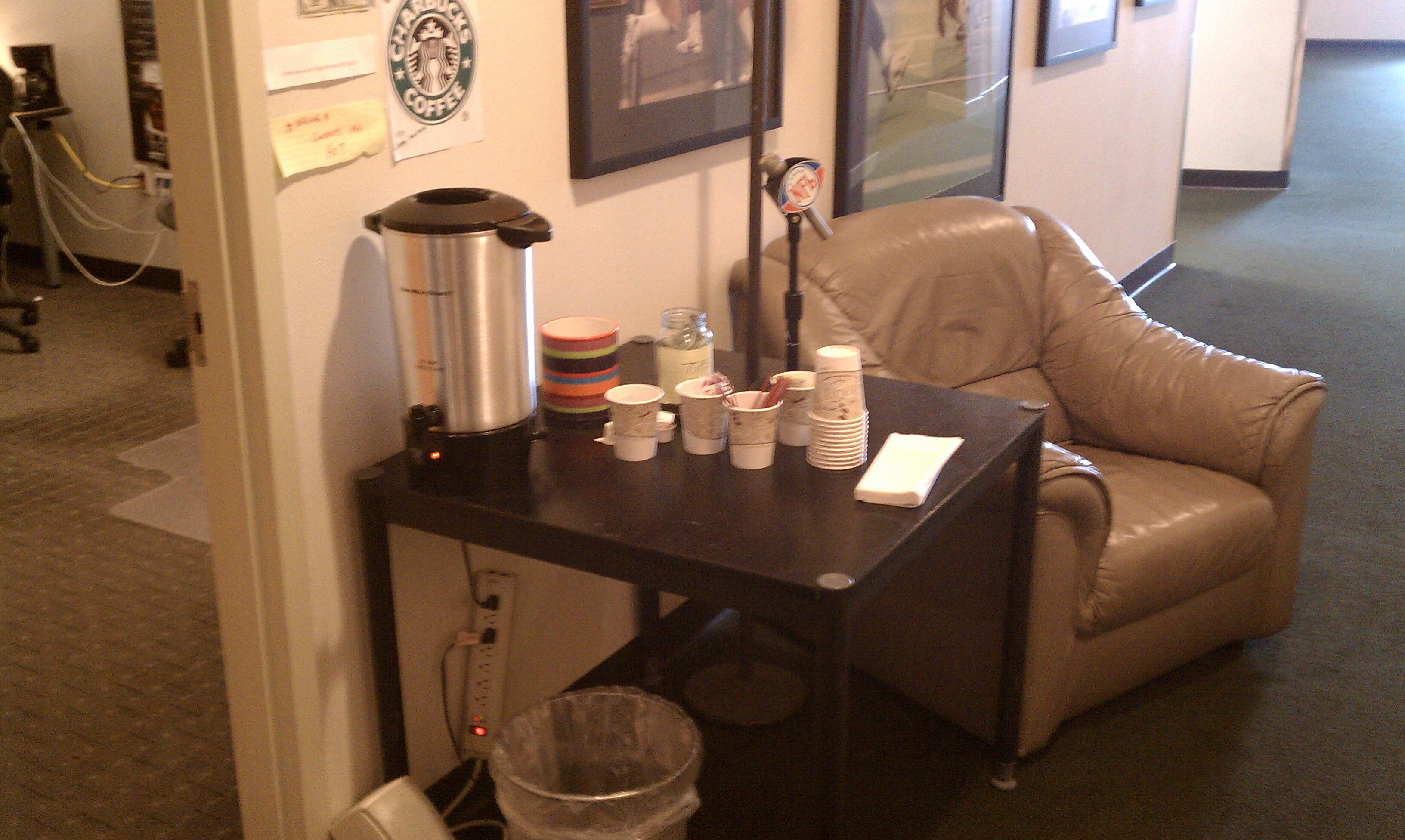 Due to certain "cutbacks," my job took all the free coffee stations out. This is the temporary station that one of my coworkers set up to replace them. tips accepted.