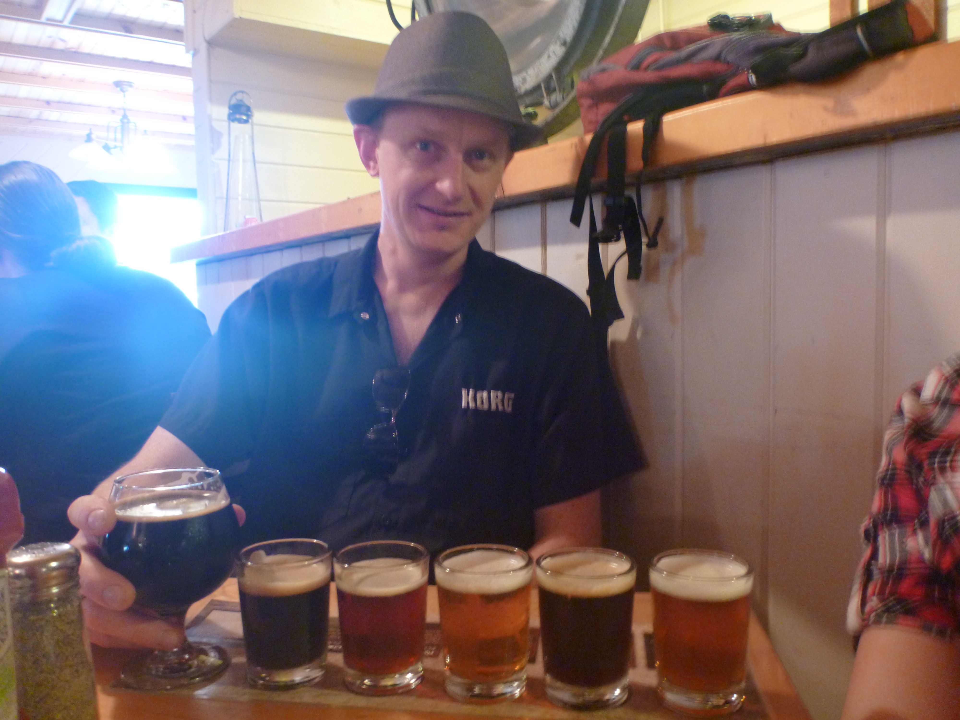 this appears to be a flight of beers, but you'd be foolish to not assume it's actually a round of whiskey shots.