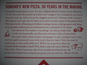 The local Domino’s Pizza is literally a mile from our house. In the three years we’ve lived in Atco, we’ve gotten pizza from them twice. The first time was the day we moved in because it was close, fast, cheap, and fed our friends quickly. I wanted to try the new Domino’s pizza because they have been so damn bold in their advertising campaign. Their introductory deal of two medium pies, each with two toppings, for 12 bucks, made it especially tempting. We NEVER eat fast food, but I wanted to give this a shot as an experiment and, self-fulfilling enough, as a blog entry.