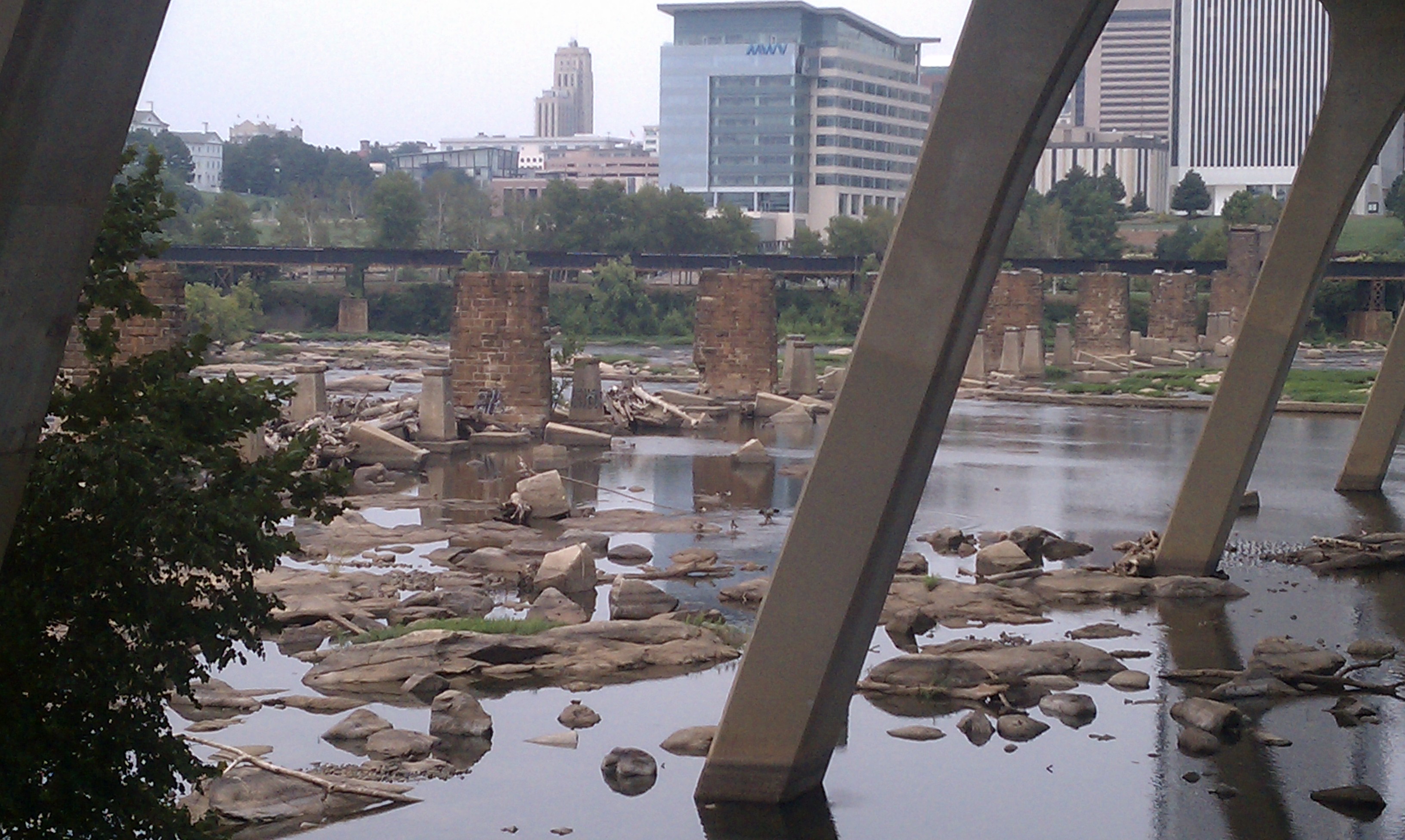 this is looking in the other direction. Richmond is on the other bank. I'm standing under the newer car bridge, and you can see the old, abandoned one over on the left.